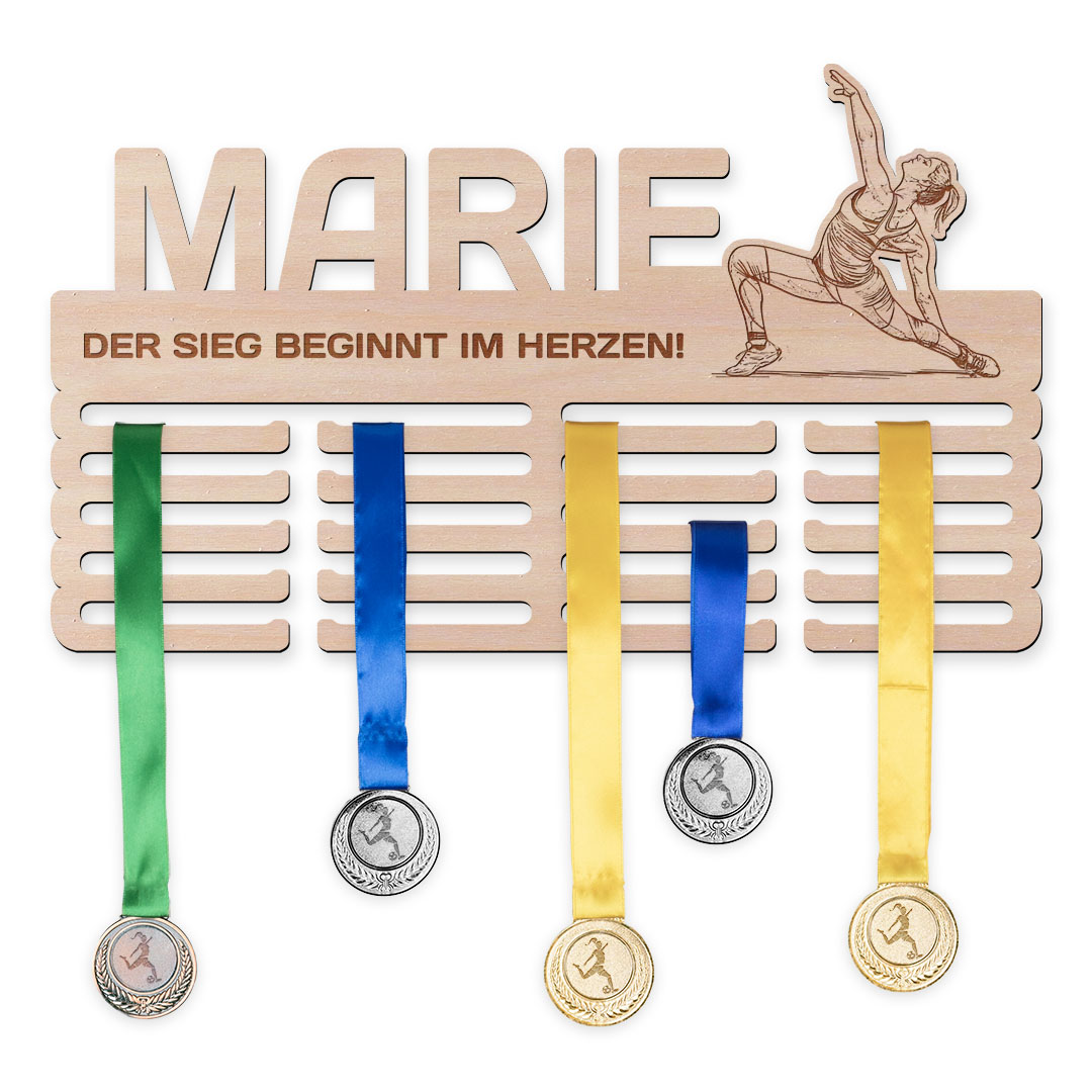 Wir fertigen Medaillenhalter maßgeschneidert nach Ihren Wünschen. Geben Sie einfach den Namen, einen motivierenden Spruch und eine sportliche Silhouette an, und wir kümmern uns um den Rest.