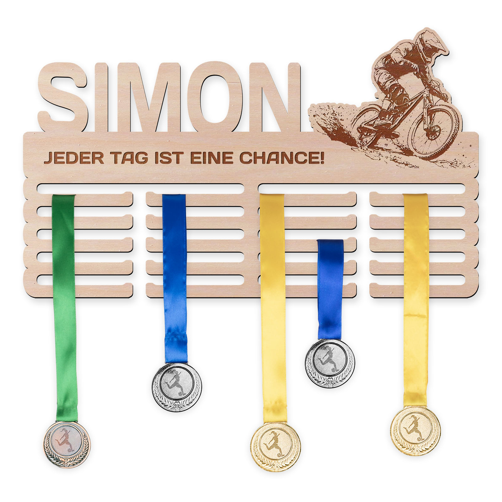 Wir fertigen Medaillenhalter maßgeschneidert nach Ihren Wünschen. Geben Sie einfach den Namen, einen motivierenden Spruch und eine sportliche Silhouette an, und wir kümmern uns um den Rest.